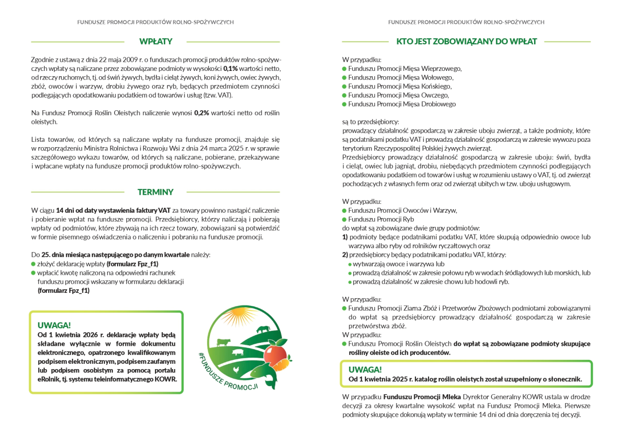 Krajowy Ośrodek Wsparcia Rolnictwa OT w Białymstoku informuje, iż od 1 kwietnia 2026 r. deklaracje wpłaty na fundusze promocji produktów rolno-spożywczych (formularz FPZ_f1), należy składać wyłącznie w formie dokumentu elektronicznego opatrzonego kwalifikowanym podpisem elektronicznym albo podpisem zaufanym, albo podpisem osobistym, za pomocą portalu eRolnik: https://erolnik.gov.pl/#/, tj. systemu teleinformatycznego KOWR.