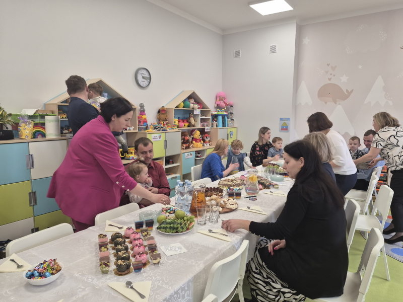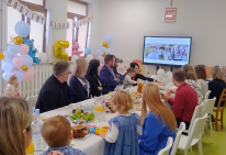 Ważnym punktem spotkania była promocja programu „Aktywny Maluch” 2022-2029, do którego placówka przystąpiła od stycznia. Program wspiera opiekę nad dziećmi do lat 3 i ułatwia rodzicom powrót na rynek pracy. Dzięki środkom z programu udało się przeprowadzić modernizację placu zabaw z zagospodarowaniem terenu oraz zakupić nowe pomoce dydaktyczne, zabawki wzbogacając wyposażenie placówki. Spotkanie uatrakcyjniły balony i długopisy promujące udział w programie.