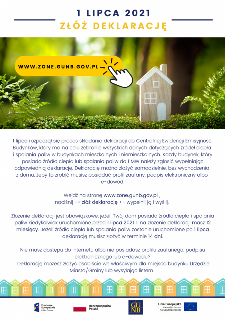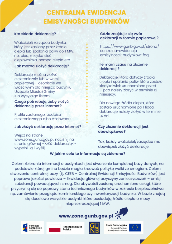 Od 1 lipca 2021r. każdy właściciel lub zarządca budynku ma obowiązek złożenia deklaracji dotyczącej źródeł ciepła i spalania paliw. Deklarację można złożyć za pośrednictwem systemu teleinformatycznego Centralnej Ewidencji Emisyjności Budynków (CEEB) lub w Urzędzie Gminy. Właściciele budynków już istniejących mają 12 miesięcy na dokonanie zgłoszenia, a dla budynków nowo powstałych obowiązuje termin 14 dni.