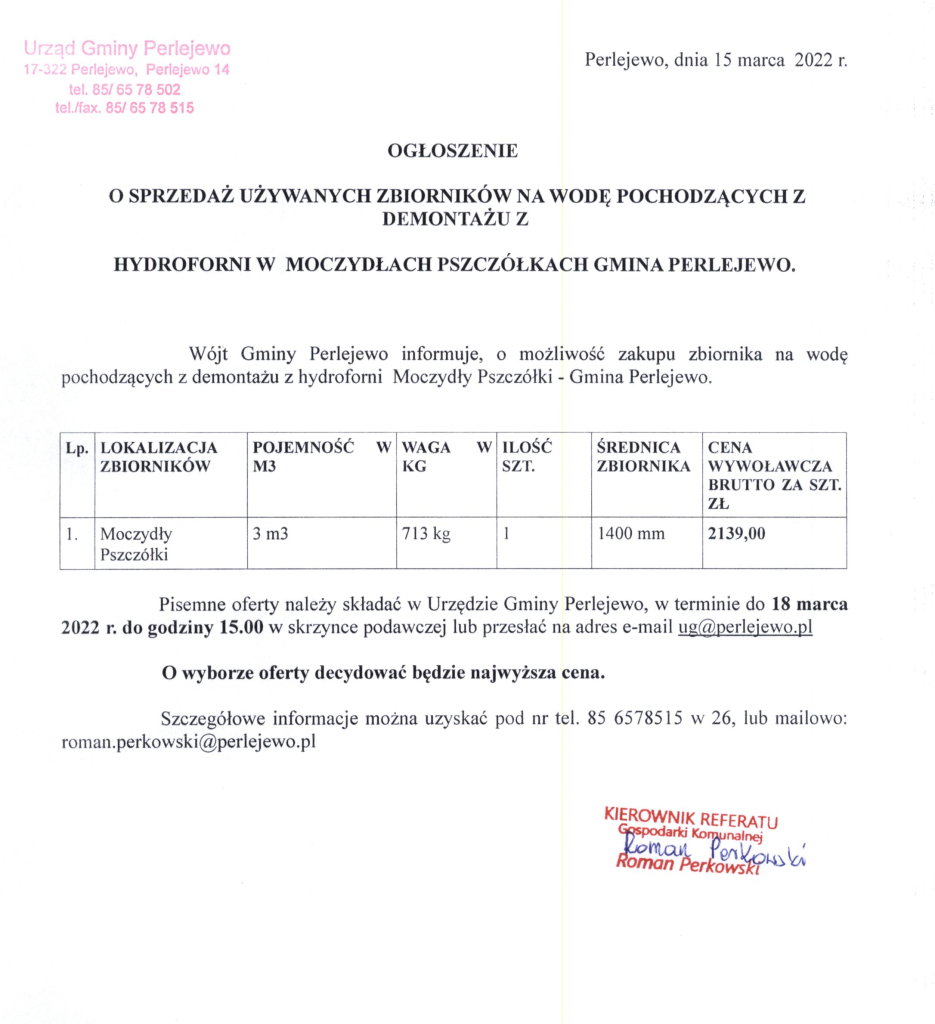 Wójt Gminy Perlejewo przyjmuje interesantów w każdą środę w godz. 9-12. Prosimy o wcześniejsze telefoniczne potwierdzenie obecności.