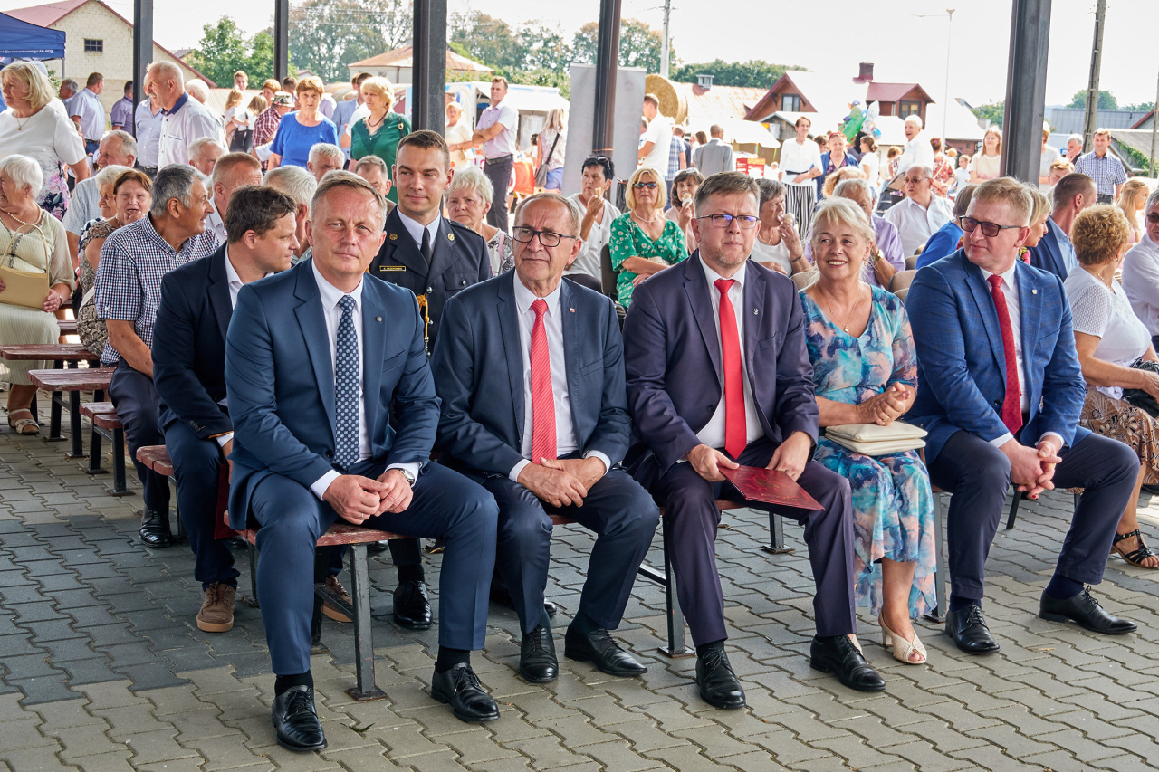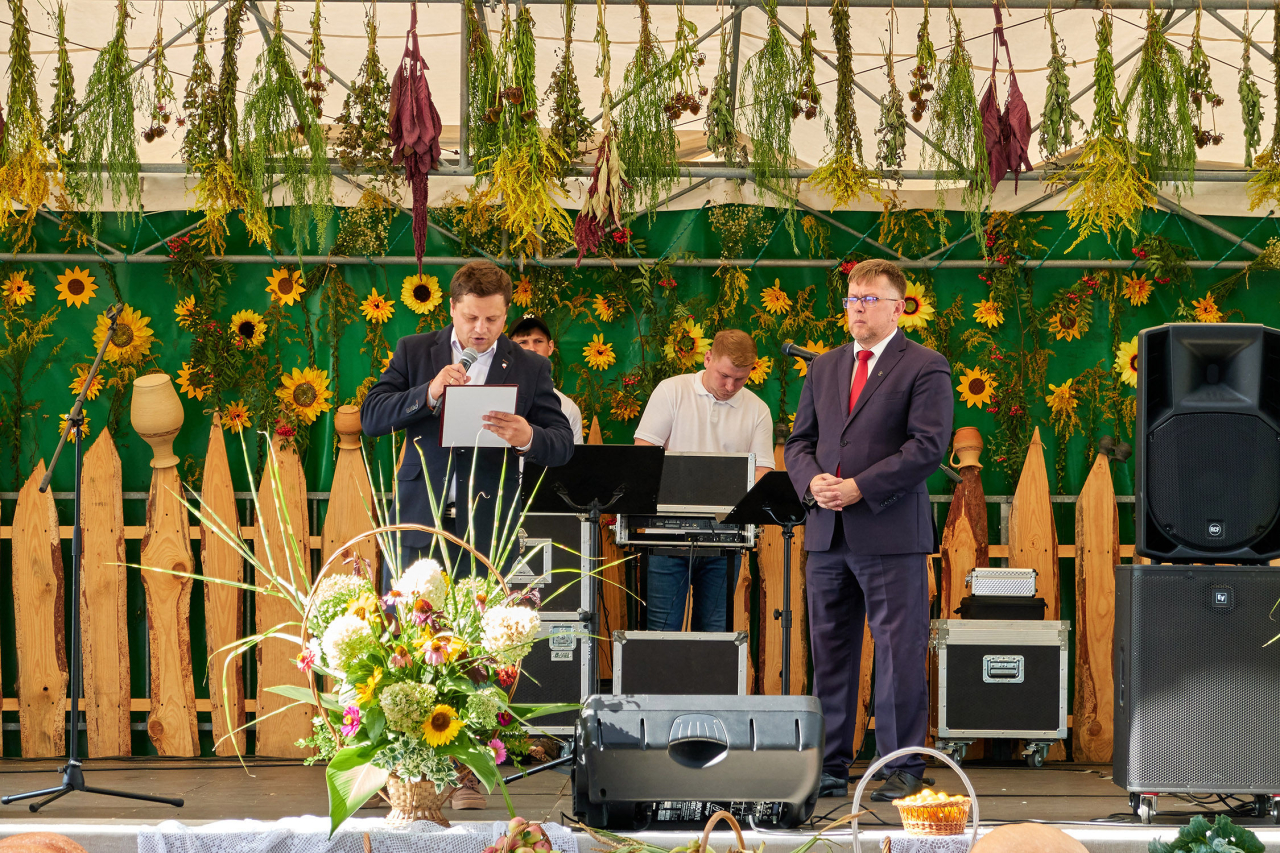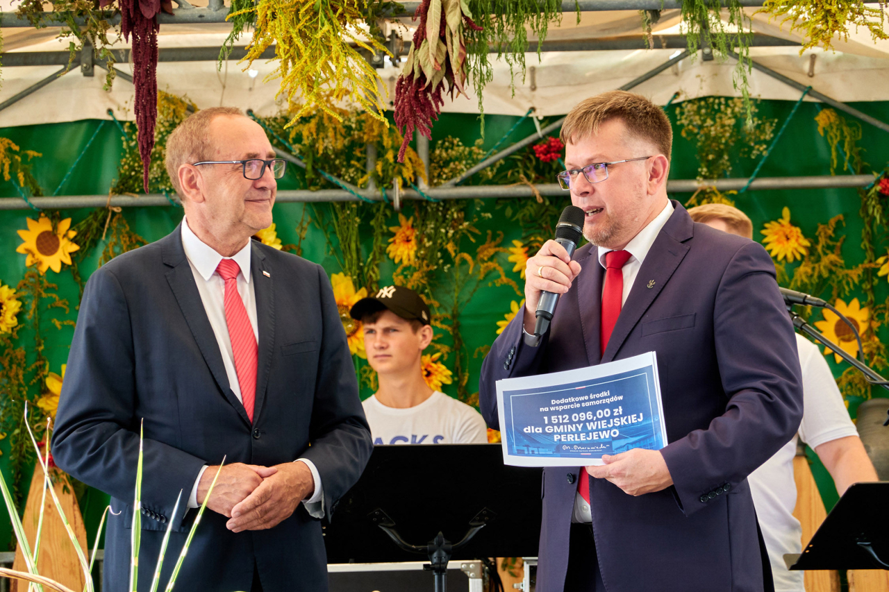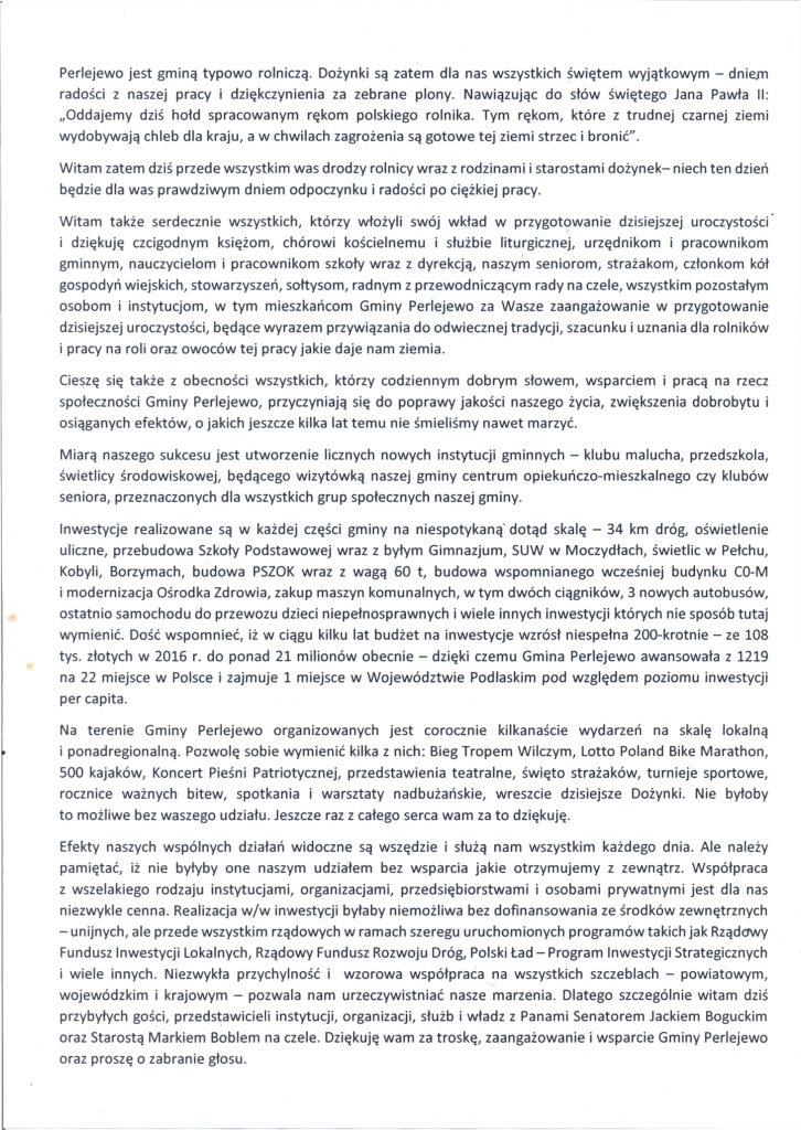 Otwarcia Dożynek dokonał Pan Jakub Wierzbicki – Wójt Gminy Perlejewo oraz Starostowie tegorocznych dożynek Maria i Krzysztof Parzonko. Gospodarze dożynek przełamali się chlebem z licznie zgromadzonymi uczestnikami wydarzenia. Po otwarciu uroczystości głos zabrali zaproszeni goście: Pan Jacek Bogucki Senator RP, który wręczył Panu Wójtowi symboliczne czeki na kolejne dofinansowania dla Gminy Perlejewo. Głos zabrał również Pan Marek Bobel Starosta Powiatu Siemiatyckiego, Pan Wojciech Szawkało, Pan Grzegorz Leszczyński Prezes Podlaskiej Izby Rolniczej oraz Pan Jerzy Leszczyński Radny Województwa Podlaskiego.