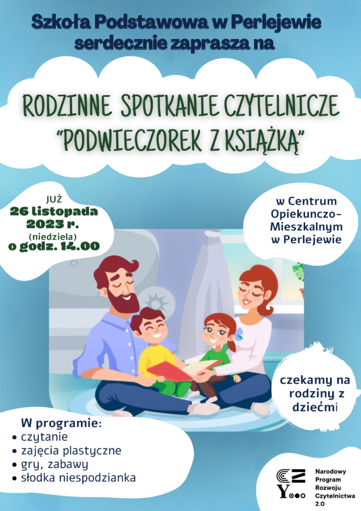 Serdecznie zapraszamy na pierwsze spotkanie czytelnicze ,,Podwieczorek z książką'', które odbędzie się 26 listopada 2023 r. (niedziela)  o godzinie 14.00 w Centrum Opiekuńczo - Mieszkalnym w Perlejewie.
