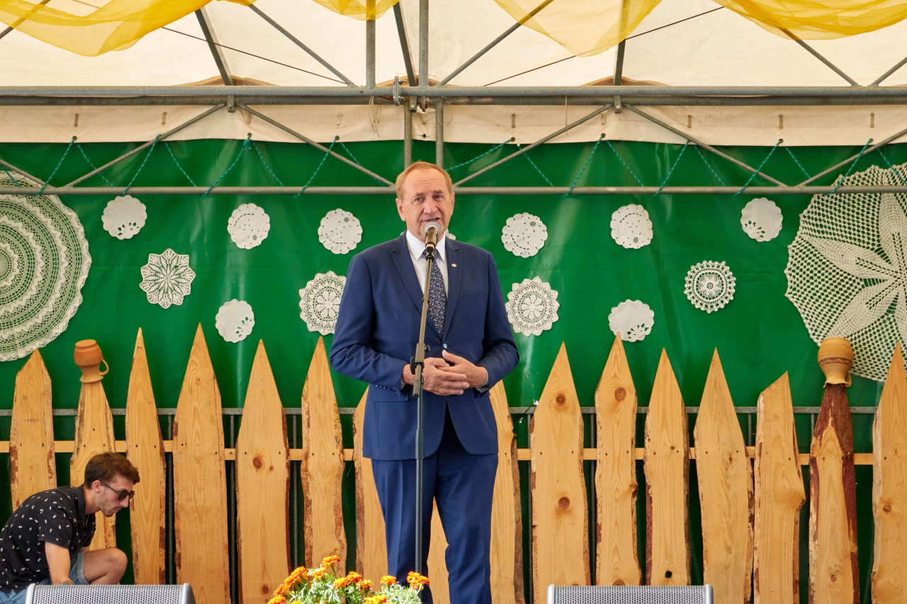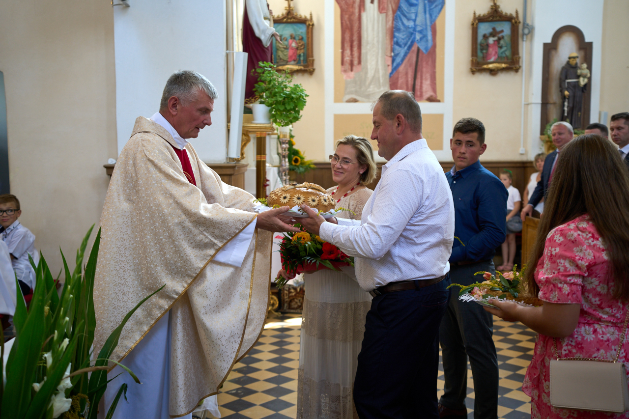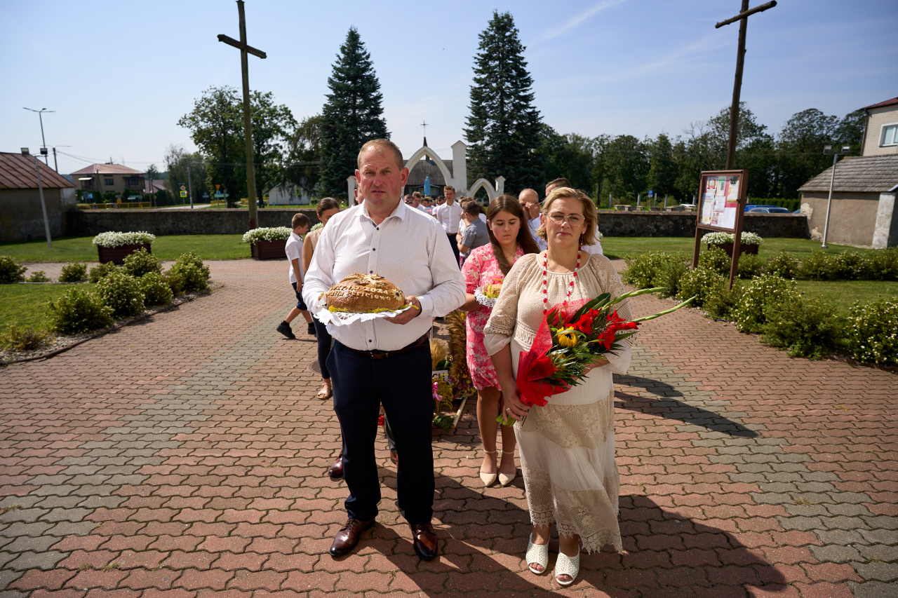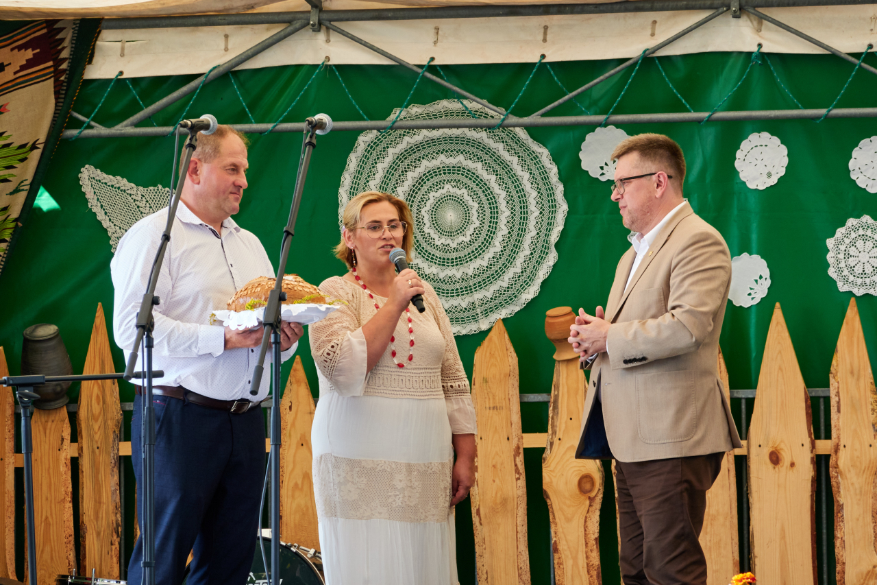 Pan Jakub Wierzbicki – Wójt Gminy Perlejewo oraz Starostowie tegorocznych dożynek Iwona i Krzysztof Kosińscy przełamali się chlebem z licznie zgromadzonymi uczestnikami.