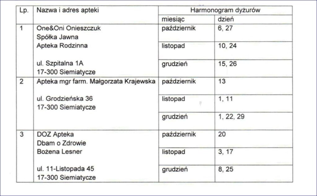 Zgodnie z Uchwałą nr 15/67/24 Zarządu Powiatu Siemiatyckiego z dnia 24 września 2024 roku na terenie powiatu siemiatyckiego od dnia 1 października 2024 roku do 31 grudnia 2024 r. dyżury aptek w dni wolne od pracy (niedziele i święta) pełnione będą rotacyjnie przez 3 apteki w godz. 14.00 – 21.00. Harmonogram dyżurów aptek zamieszczamy poniżej