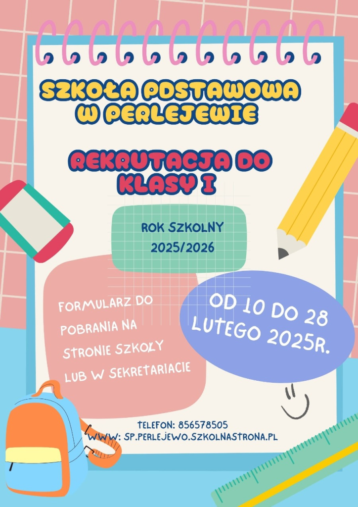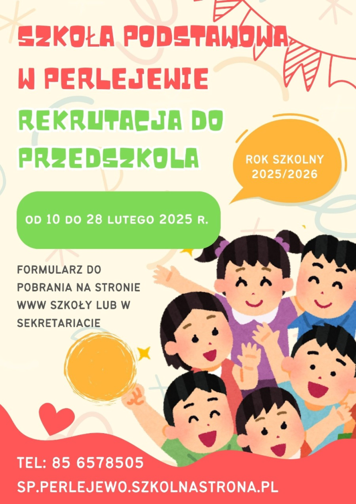 Informujemy, iż od dnia 10 do 28 lutego 2025 r. trwa rekrutacja do szkoły podstawowej i przedszkola na rok szkolny 2025/2026.