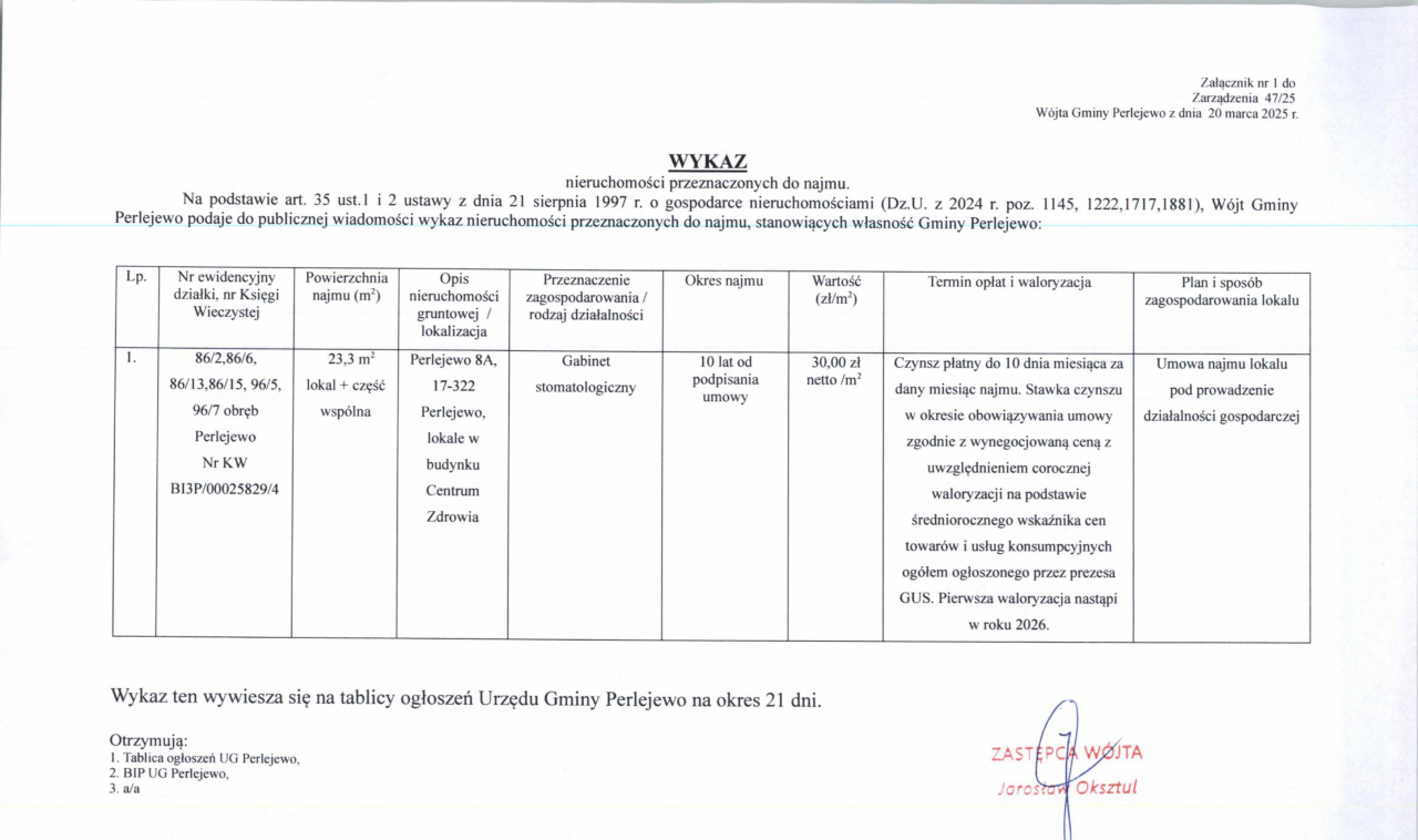 Na podstawie art. 35 ust.1 i 2 ustawy z dnia 21 sierpnia 1997 r. o gospodarce nieruchomościami, Wójt Gminy Perlejewo podaje do publicznej wiadomości wykaz nieruchomości przeznaczonych do najmu, stanowiących własność Gminy Perlejewo.