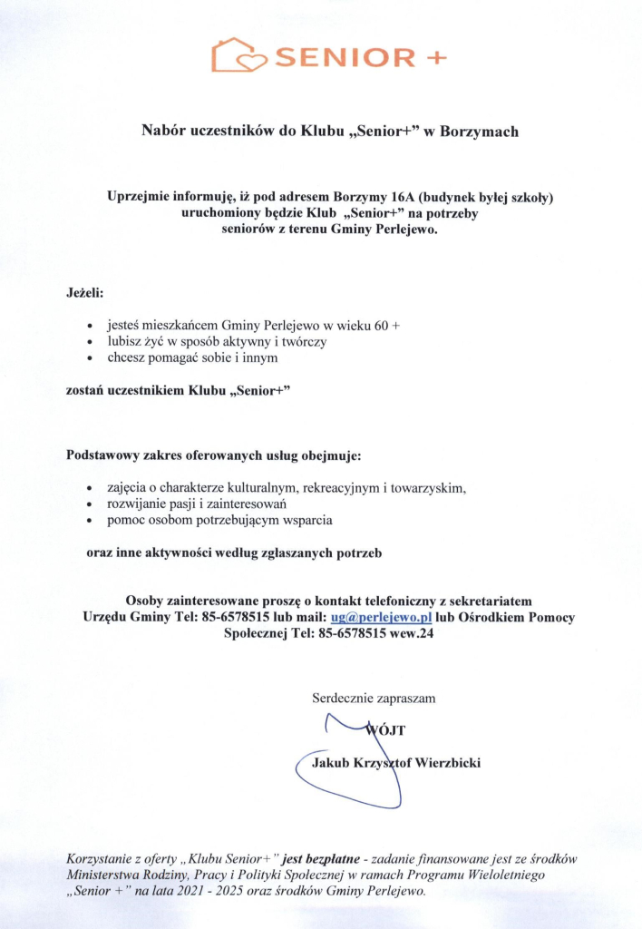 Nabór uczestników do Klubu ,,Senior+'' w Borzymach