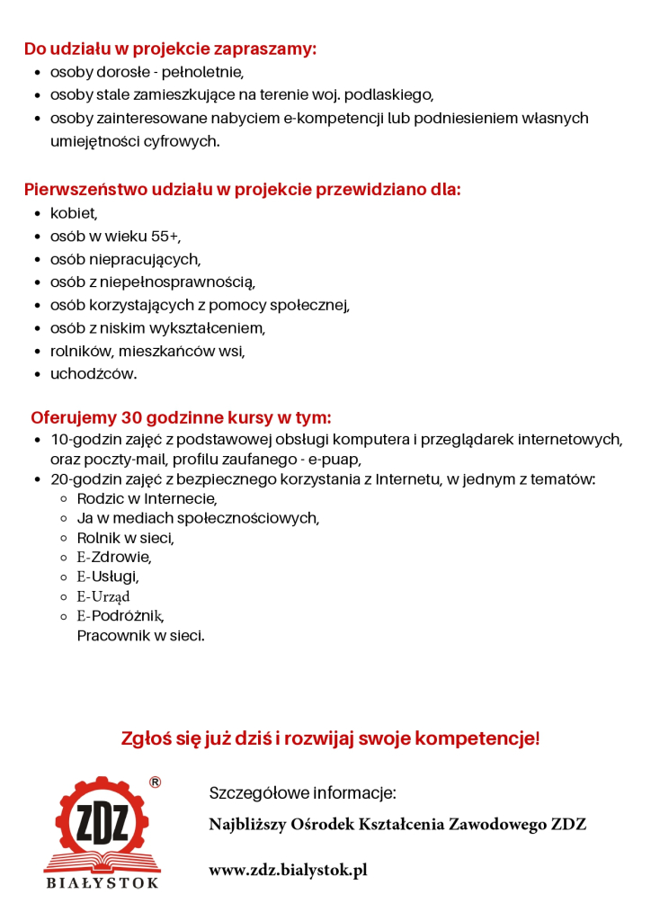 Projekt adresowany jest do 1 250 dorosłych osób, stale zamieszkujących na terenie woj. podlaskiego, cechujących się brakiem lub bardzo niskimi e-kompetencjami, którzy z własnej inicjatywy zainteresowani są nabyciem lub podniesieniem umiejętności cyfrowych. Pierwszeństwo udziału w projekcie przewidziano dla: kobiet, osób w wieku 55+, osób z niepełnoprawnością, osób korzystających z pomocy społecznej, rolników, osób z niskim wykształceniem, osób niepracujących oraz mieszkańców wsi i uchodźców.