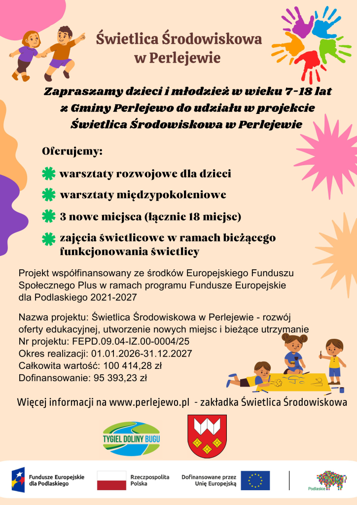 Kierownik Świetlicy Środowiskowej informuje o rozpoczęciu rekrutacji do projektu „Świetlica Środowiskowa w Perlejewie – rozwój oferty edukacyjnej, utworzenie nowych miejsc i bieżące utrzymanie” współfinansowanego ze środków Europejskiego Funduszu Społecznego Plus w ramach Programu Fundusze Europejskie dla Podlaskiego 2021-2027