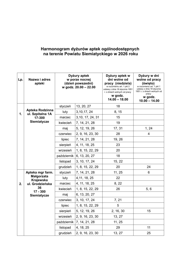 Zgodnie z uchwałą Zarządu Powiatu Siemiatyckiego  Nr 64/298/25 z dnia 18 grudnia 2025 roku od 1 stycznia 2026 roku do pełnienia dyżurów w porze nocnej i dyżurów w dni wolne od pracy na terenie Powiatu Siemiatyckiego zostały wyznaczone 4 apteki położone na terenie Miasta Siemiatycze. Dyżury będą pełnione przez wyznaczone apteki w sposób rotacyjny (w poszczególnych dniach i godzinach) zgodnie z harmonogramem dyżurów aptek ogólnodostępnych na terenie Powiatu Siemiatyckiego w 2026 roku.