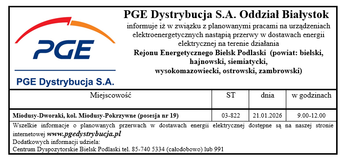 Bieżące informacje o wyłączeniach znajdują się też na stronie internetowej: www.pgedystrybucja.pl w zakładce „Wyłączenia".