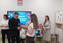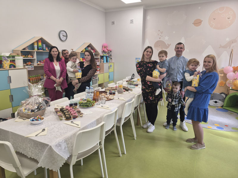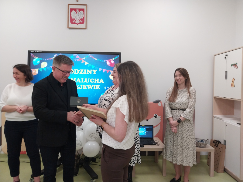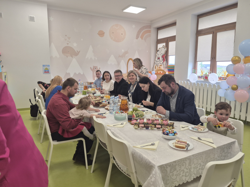 Ważnym punktem spotkania była promocja programu „Aktywny Maluch” 2022-2029, do którego placówka przystąpiła od stycznia. Program wspiera opiekę nad dziećmi do lat 3 i ułatwia rodzicom powrót na rynek pracy. Dzięki środkom z programu udało się przeprowadzić modernizację placu zabaw z zagospodarowaniem terenu oraz zakupić nowe pomoce dydaktyczne, zabawki wzbogacając wyposażenie placówki. Spotkanie uatrakcyjniły balony i długopisy promujące udział w programie.