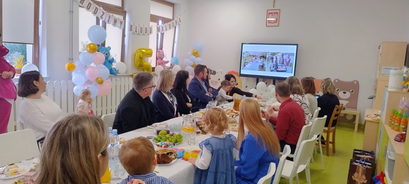Nie zabrakło serdecznych życzeń dla dzieci oraz prezentów, które sprawiły maluchom wiele radości. Uroczystość była pełna uśmiechów, zabawy i wspólnego świętowania, podkreślając, jak ważna jest opieka i edukacja najmłodszych mieszkańców naszej gminy. Jak na prawdziwe urodziny przystało, nie mogło zabraknąć uroczystego tortu i pysznego poczęstunku przygotowanego przez rodziców.