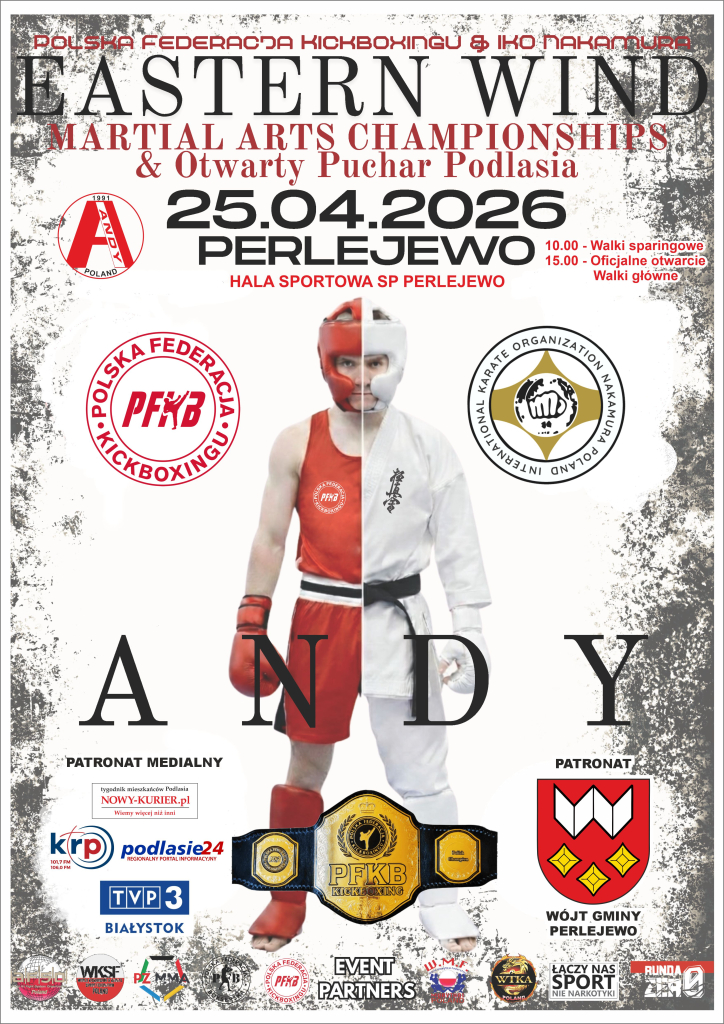 Oficjalny plakat zapowiadający Eastern Wind Martial Arts Championships & Otwarty Puchar Podlasia, które odbędą się 25 kwietnia 2026 roku w Perlejewie. Na plakacie widoczne są logotypy organizatorów i partnerów oraz informacja o patronacie Wójta Gminy Perlejewo.