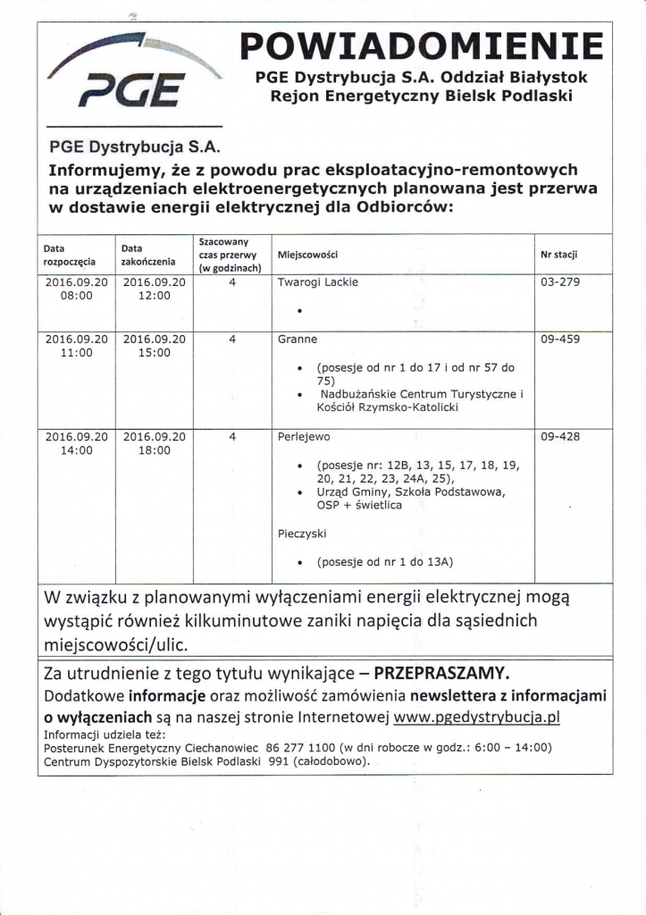 Informacja o wyłączeniach prądu