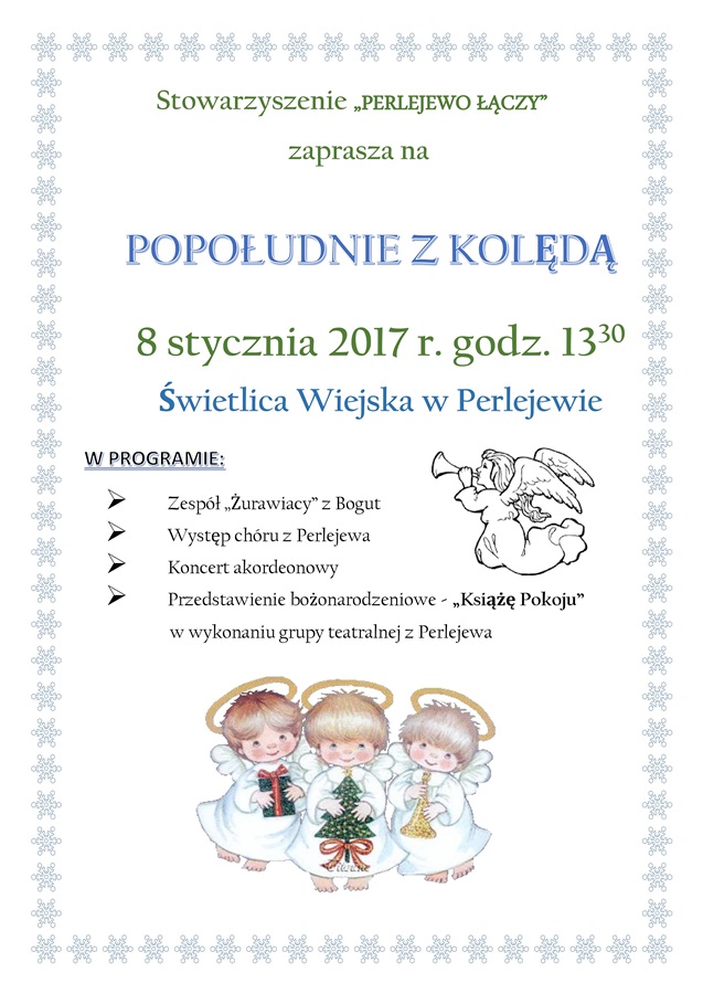 Stowarzyszenie "Perlejewo Łączy" zaprasza na występy bożonarodzeniowe. Tytuł wydarzenia - "Popołudnie z kolędą".