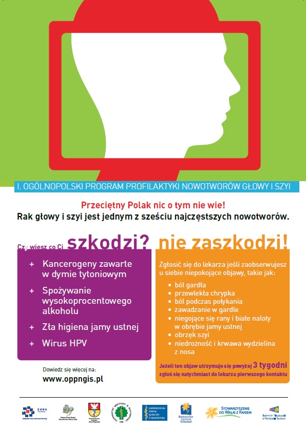 Tegoroczna edycja kampanii skupi się w naszym kraju na profilaktyce tych nowotworów, wczesnego ich wykrywania oraz leczeniu nowotworów tej okolicy, ale również na podkreśleniu konieczności starań o jak najlepszą jakość życia chorych na nowotwory okolicy głowy i szyi po leczeniu przeciwnowotworowym.     Raki głowy i szyi to nowotwory złośliwe występujące w obrębie wszystkich narządów głowy i szyi – z wyjątkiem mózgu. Są to głownie raki: wargi, dna jamy ustnej, języka, migdałków, gardła, krtani, nosa i zatok przynosowych, tarczycy, skóry twarzy i szyi.     Pod względem częstości występowania zajmują 6 miejsce w Polsce. Jeżeli nowotwór z tego obszaru zostanie zdiagnozowany we wczesnym etapie zaawansowania to stopień przeżywalności wynosi nawet 80-90%    Czynnika mi ryzyka rozwoju nowotworów okolicy głowy i szyi są: alkohol, papierosy, przewlekłe drażnienie błony śluzowej jamy ustnej i gardła (np. przez źle dopasowane protezy, ułamane korony zębów, przewlekła stany zapalne). W Polsce podobnie jak w innych krajach Europy, obserwuje się nowe zjawisko, określane jako „fenomen epidemiologiczny” tzn. wzrost liczby nowych zachorowań na nowotwory głowy i szyi u ludzi poniżej 40 roku życia, którzy nigdy nie palili ani nie nadużywali alkoholu. Grupa ta określana jest jako młodzi dorośli. Badania naukowe wskazują, że czynnikiem potencjalnego ryzyka w tej grupie jest infekcja wirusem brodawczaka ludzkiego (HPV). Podczas Europejskiego Tygodnia Profilaktyki Nowotworów Głowy i Szyi odbędzie się w mediach i w szkołach średnich akcja edukacyjno-informacyjna z udziałem przedstawicieli środowisk medycznych.
