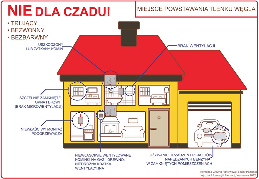 Tlenek węgla, potocznie zwany czadem, jest gazem silnie trującym, bezbarwnym i bezwonnym, nieco lżejszym od powietrza, co powoduje, że łatwo się z nim miesza i rozprzestrzenia. Powstaje w wyniku niepełnego spalania wielu paliw m.in. drewna, oleju, gazu, benzyny, nafty, propanu, węgla, ropy, spowodowanego brakiem odpowiedniej ilości tlenu, niezbędnej do zupełnego spalania. Może to wynikać z braku dopływu świeżego (zewnętrznego) powietrza do urządzenia, w którym następuje spalanie albo z powodu zanieczyszczenia, zużycia lub złej regulacji palnika gazowego, a także przedwczesnego zamknięcia paleniska pieca lub kuchni. Jest to szczególnie groźne w mieszkaniach, w których okna są szczelnie zamknięte lub uszczelnione na zimę. Czad powstaje także często podczas pożaru. Niebezpieczeństwo zaczadzenia wynika z faktu, że tlenek węgla jest gazem niewyczuwalnym dla człowieka. Dostaje się do organizmu przez układ oddechowy, a następnie jest wchłaniany do krwioobiegu. W układzie oddechowym tlenek węgla wiąże się z hemoglobiną 210 razy szybciej niż tlen, blokując dopływ tlenu do organizmu. Stwarza to poważne zagrożenie dla zdrowia i życia człowieka. Uniemożliwia prawidłowe rozprowadzanie tlenu we krwi i powoduje uszkodzenia mózgu oraz innych narządów wewnętrznych. Następstwem ostrego zatrucia może być nieodwracalne uszkodzenie ośrodkowego układu nerwowego, niewydolność wieńcowa i zawał lub nawet śmierć.