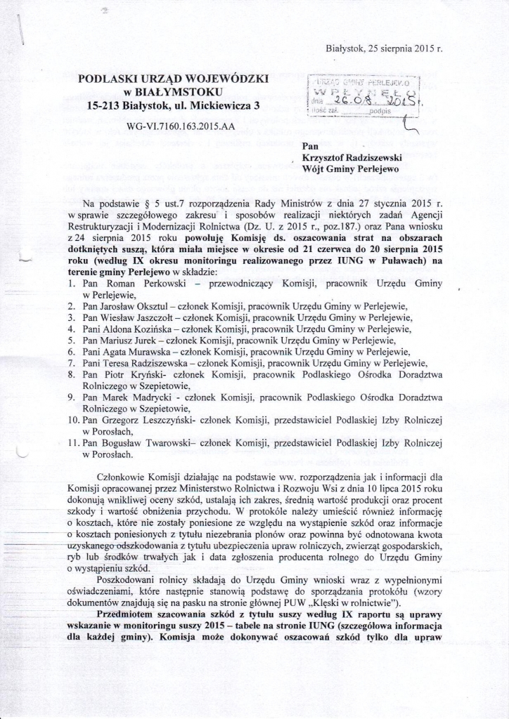 Wójt Gminy Perlejewo przyjmuje interesantów w każdą środę w godz. 9-12. Prosimy o wcześniejsze telefoniczne potwierdzenie obecności.