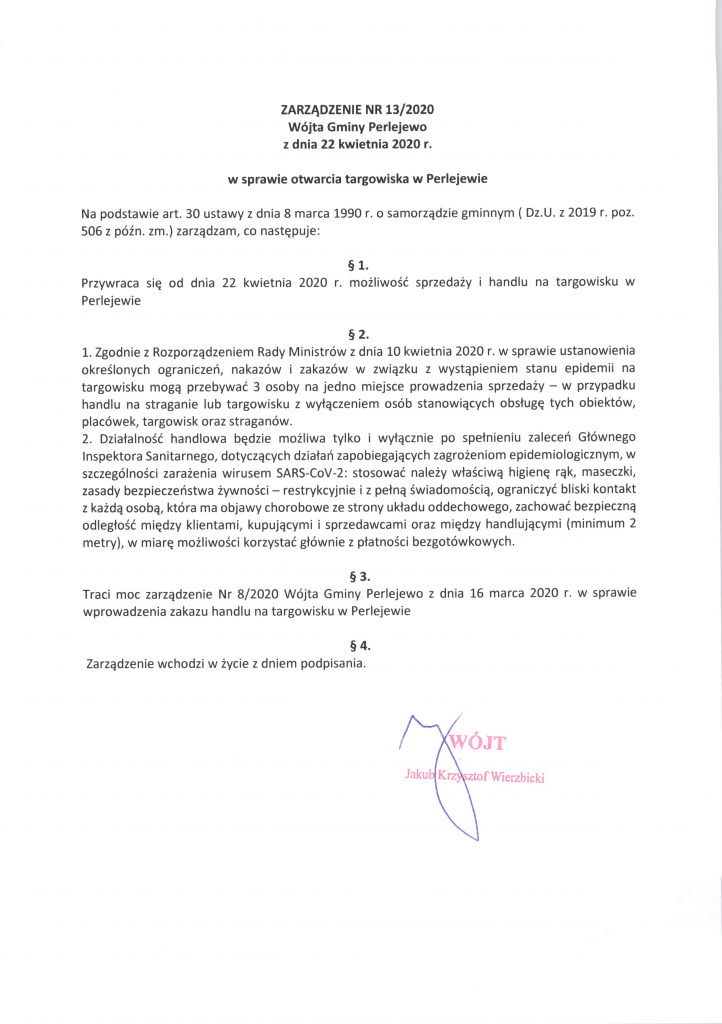 zarządzenie nr 13/2020 wójta gminy perlejewo